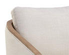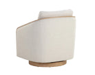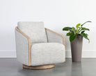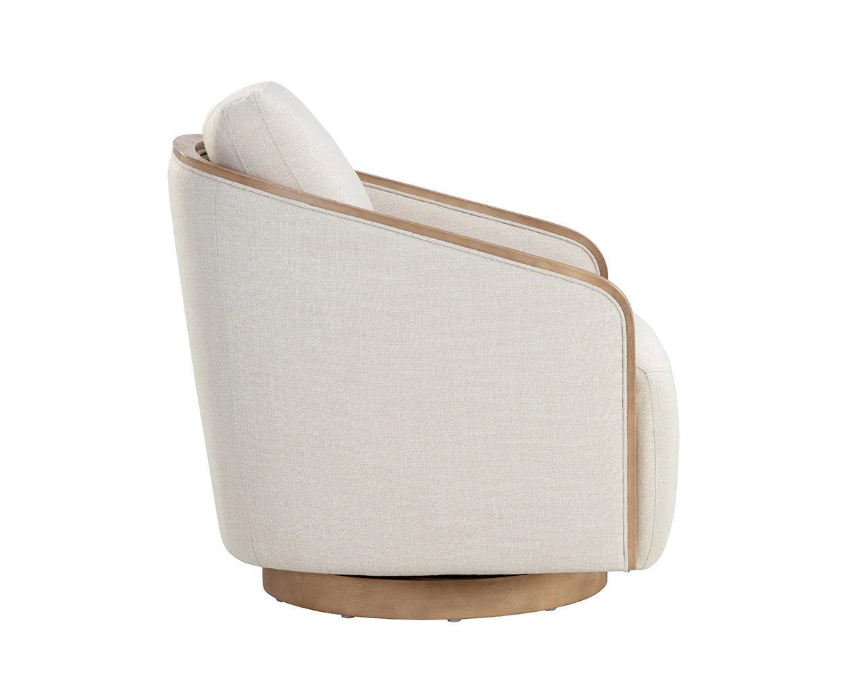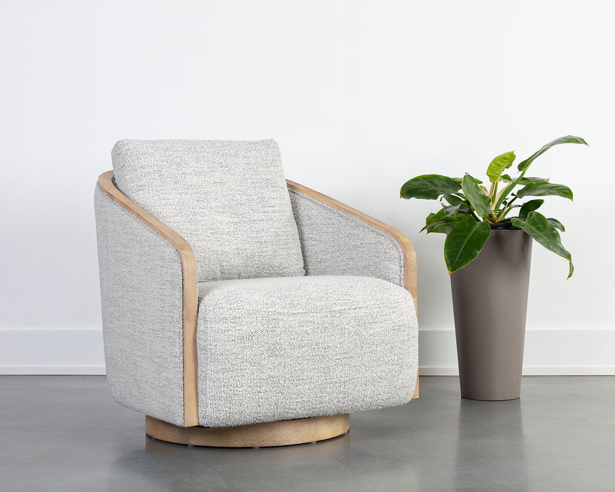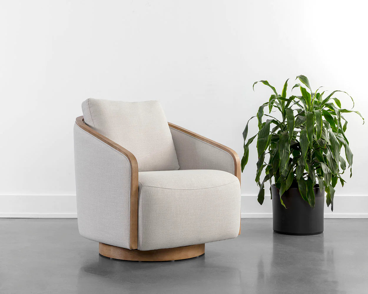 The Tasia Swivel Lounge Chair boasts a contemporary design that will fit into any living space. Upholstered in our effie linen fabric with an exposed natural birch wood frame and base. Also available in our merino cotton fabric with an exposed natural birch wood frame and base. As wood is an organic, porous material, these pieces will contain natural variation of texture and may also exhibit fine indentations and cracks. Wood pieces will also display a disparity of colour and grain, and visible knots and burls that add to the character of each piece.