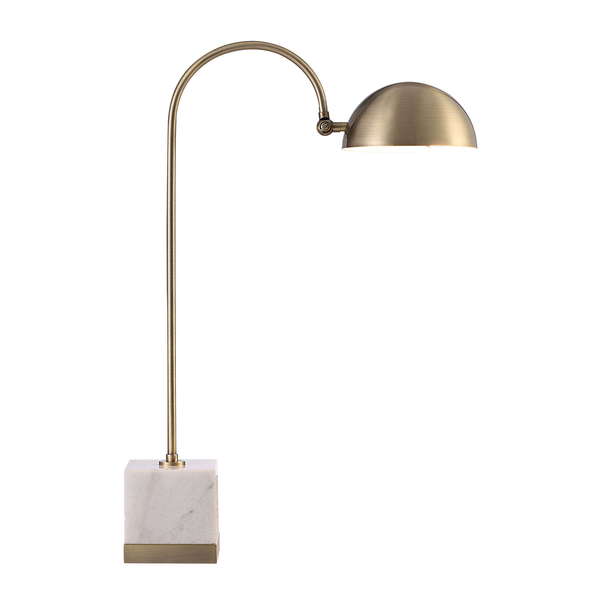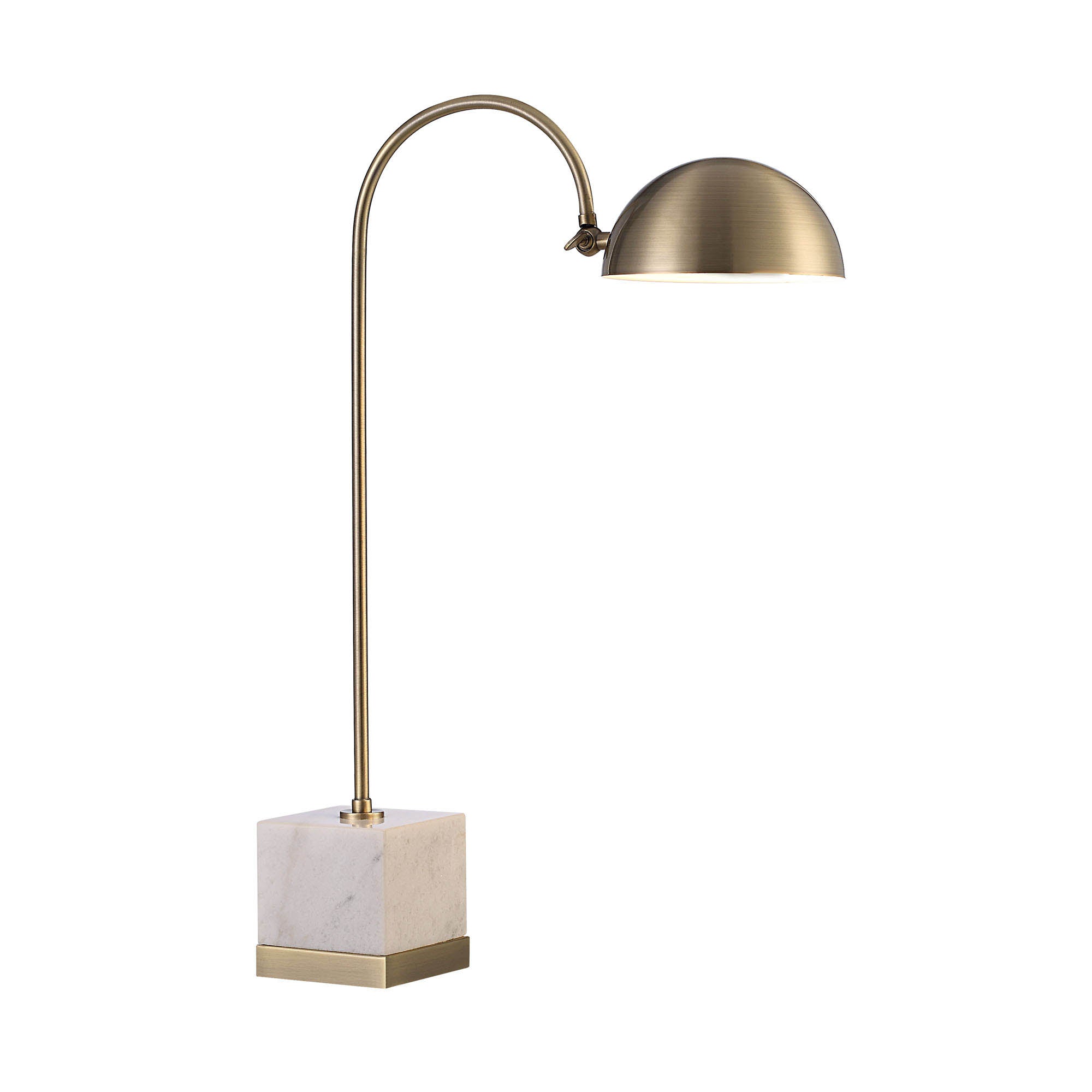 The home or business office takes on a luxe, designer quality when this table lamp enters the interior. Contrasting tones, textures and design details bring an intriguing element to this piece, allowing it to stand out without the need for additional accessories. The table lamp's antique brush brass finish, moveable dome and marble base combine beauty and purpose. Within the contemporary interior, it pairs equally well with wood and leather textiles as it does with metal and fabric.