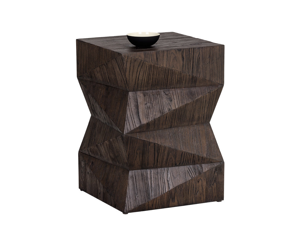 A contemporary end table designed with clean, angular lines. Crafted with solid dark brown Acacia wood, this piece is a bold addition to living, lounge and bedroom spaces. As wood is an organic, porous material, these pieces will contain natural variation of texture and may also exhibit fine indentations and cracks. Wood pieces will also display a disparity of colour and grain, and visible knots and burls that add to the character of each piece.
